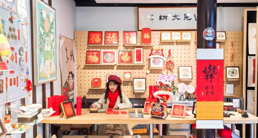 临近春节,苏州市姑苏区大儒巷38号的平江文化中心内一片热闹,不少游客在桃花坞木版年画展示销售中心一团和气馆中,体验年画制作过程,选购非遗文创产品,沉浸式感受中华优秀传统文化的独特魅力。“蛇年要来了,我特意来买一些与生肖相关的年画和趣味摆件,为家中增添喜庆和福气。”市民杜女士说。