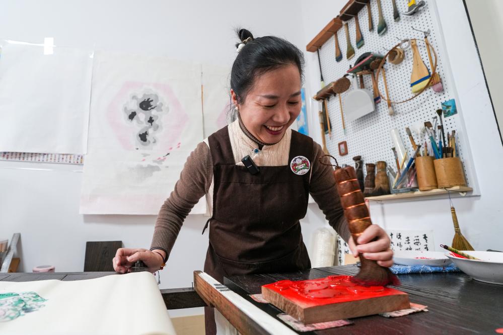 1月19日,游客在一团和气馆中体验桃花坞木版年画产品。新华社发