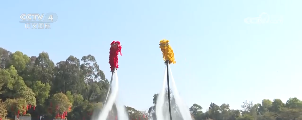 在广州莲花山旅游景区,一对醒狮脚踏飞行器腾空而起,这种将传统岭南醒狮文化与现代科技相结合的方式,让游客耳目一新。在另一景区里,独特的岭南醒狮表演被搬到了水上,更是给游客带来全新的体验。