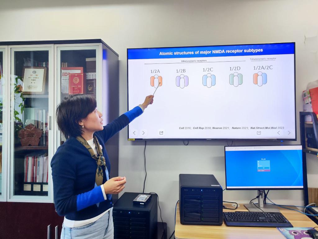 竺淑佳向记者介绍团队聚焦的NMDA受体相关研究。 新华社记者 董雪 摄