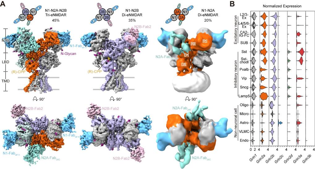 近日,来自中国科学院脑智卓越中心的竺淑佳研究员团队,凭借多年技术沉淀与创新探索,成功从成年哺乳动物的大脑皮层和海马中提取NMDA受体,首次以原子分辨率将内源NMDA受体的三维结构呈现出来,并详细揭示了该受体的3种主要亚型及比例,相关成果23日在线发表于国际学术期刊《细胞》。