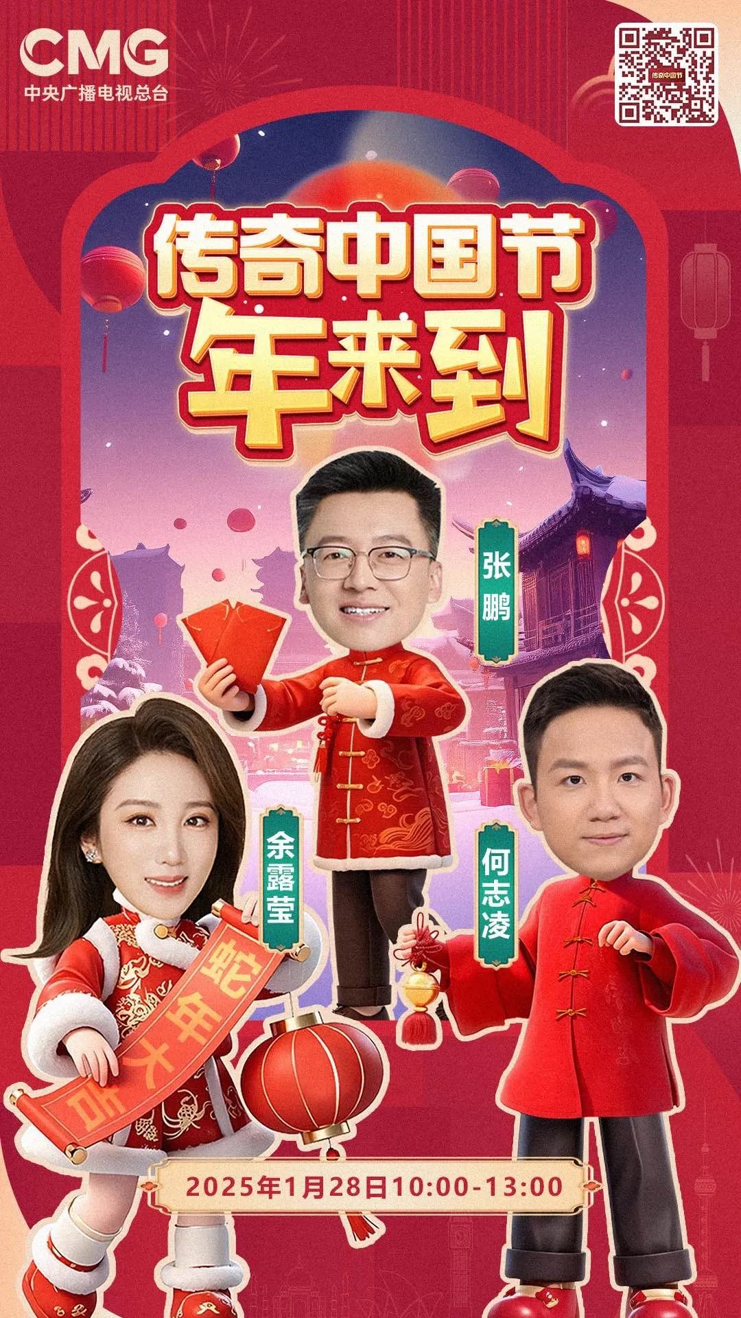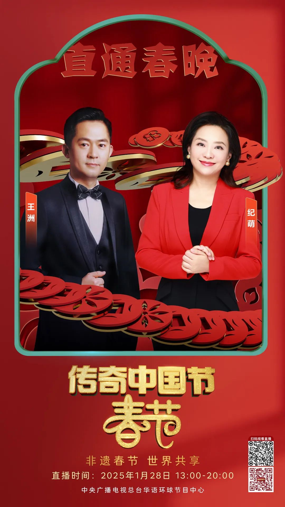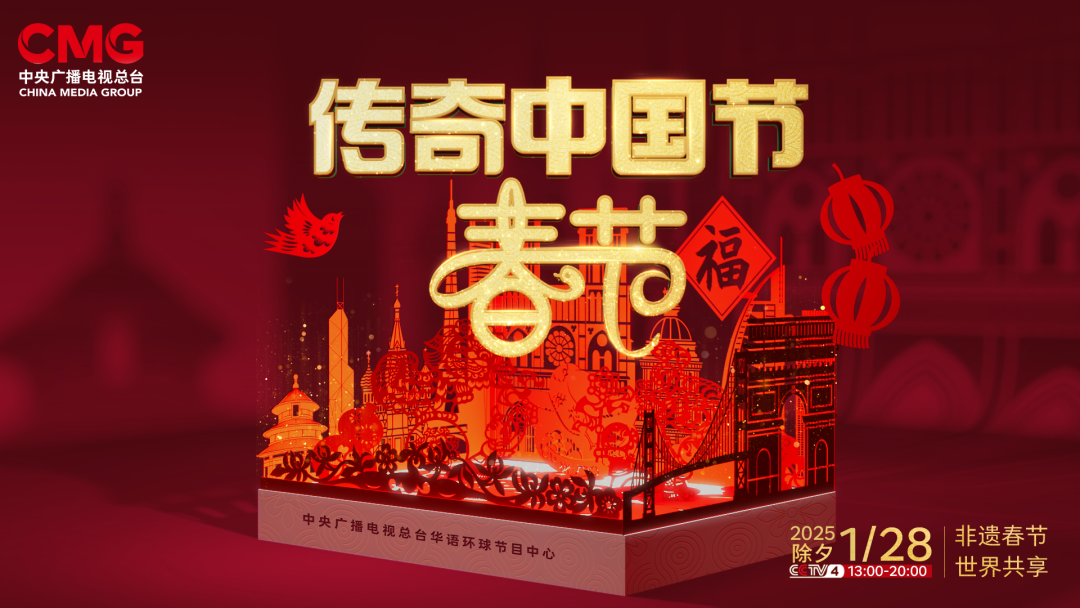 1月28日(除夕)13:00-20:00,总台CCTV4连续第18年推出大型电视直播特别节目《传奇中国节 春节》。中文国际频道亚欧美三版、CCTV4微博、抖音、快手、微信视频号等新媒体矩阵、南海之声广播频率同步直播,一同开启这场跨越国界、“非”同寻常的新春之旅!以“非遗春节 世界共享”为主题,用心用情为海内外观众打造一场创意无限、全球同欢的文化盛宴,与大家一起直通总台春晚,展望如意新春!