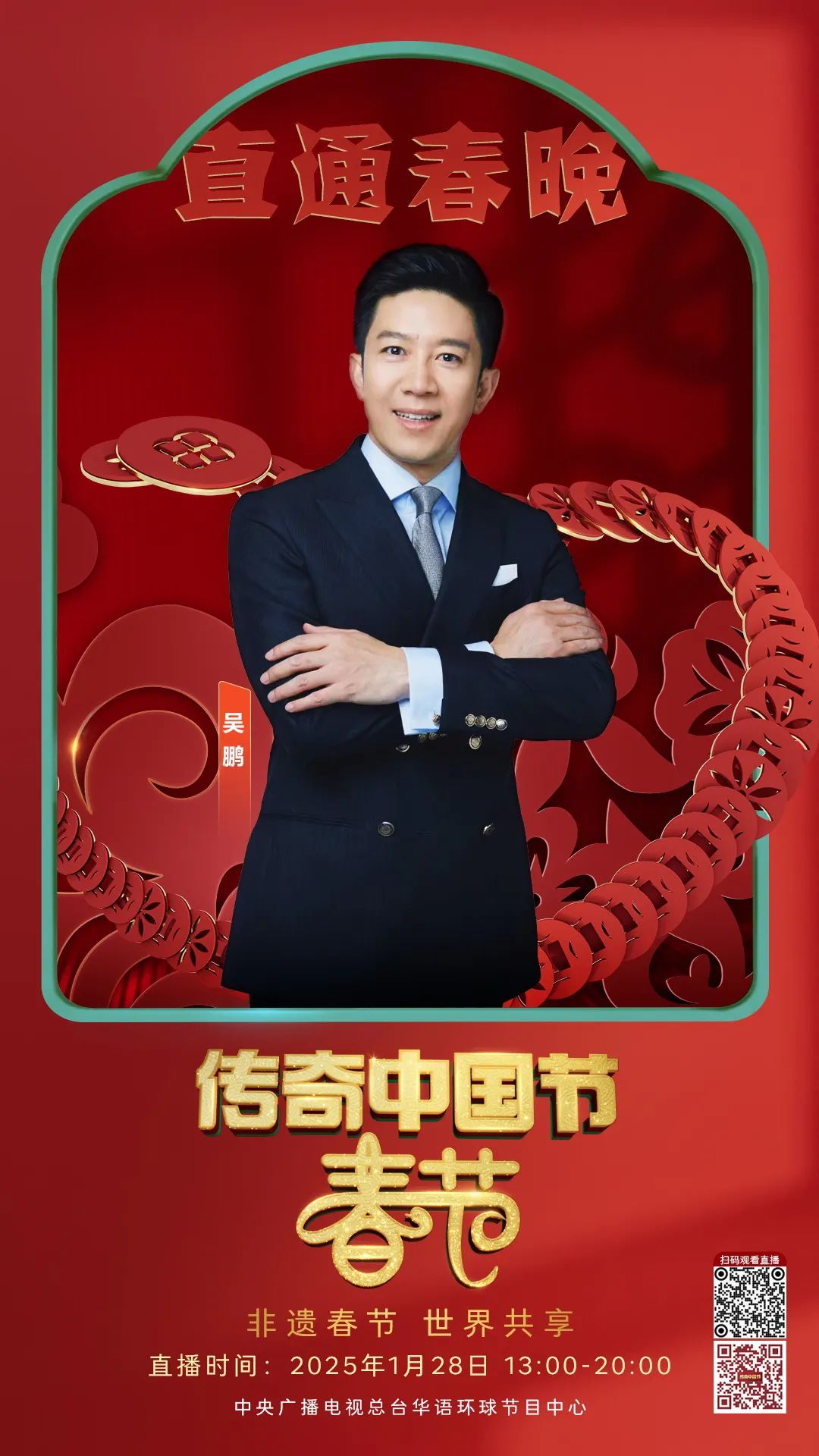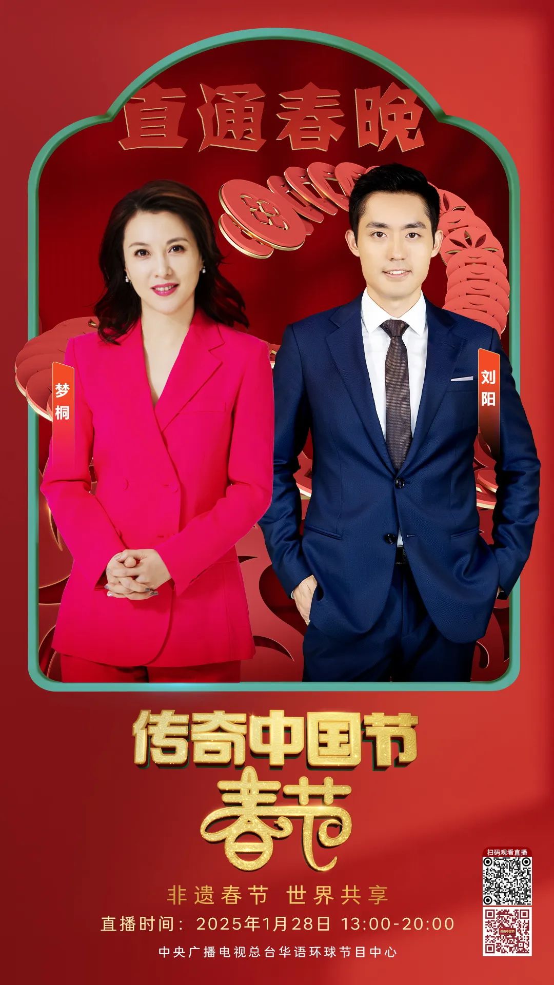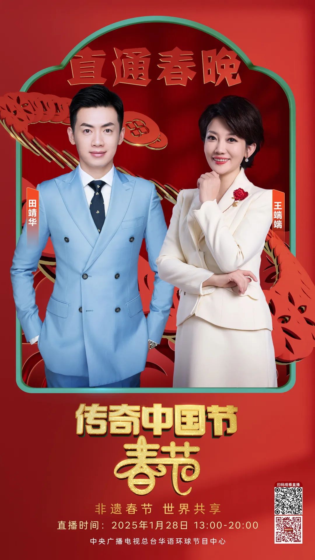 1月28日(除夕)13:00-20:00,总台CCTV4连续第18年推出大型电视直播特别节目《传奇中国节 春节》。中文国际频道亚欧美三版、CCTV4微博、抖音、快手、微信视频号等新媒体矩阵、南海之声广播频率同步直播,一同开启这场跨越国界、“非”同寻常的新春之旅!以“非遗春节 世界共享”为主题,用心用情为海内外观众打造一场创意无限、全球同欢的文化盛宴,与大家一起直通总台春晚,展望如意新春!