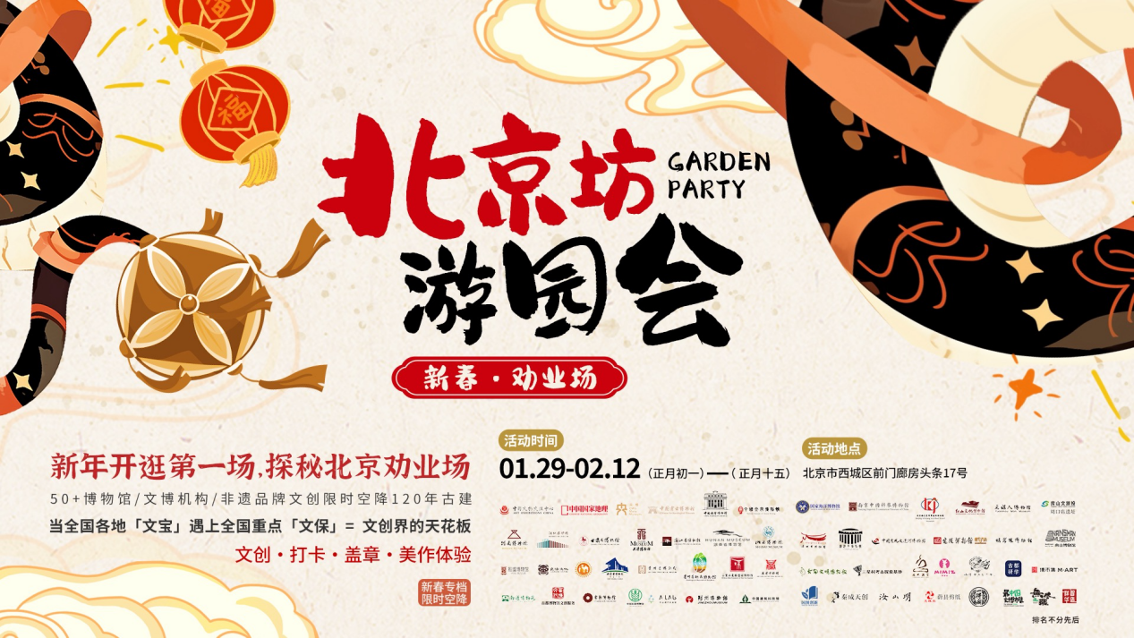2025年1月29日至2月12日(农历正月初一至正月十五),北京坊劝业场邀您共赴一场穿越千年的文化盛宴。在新春佳节来临之际,引领“文化过年”新风尚,2025北京坊游园会(以下简称“游园会”)共邀请全国各地50余家博物馆、多位非物质文化遗产传承人参加,共展出特色展品100余件、上架博物馆文创商品超过10000个品种。本次活动由中国文物交流中心、中央广播电视总台“央博”数字文化艺术博物馆、《中国国家地理》杂志社、北京市西城区文化产业发展促进中心、祥华智造以及广安控股集团、国文煊、北京坊等共同组织。