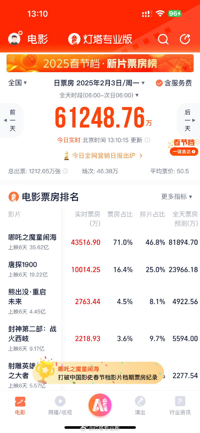 据统计,截至2月3日13时10分,《哪吒之魔童闹海》票房已达35.62亿,超过《唐人街探案3》,成为中国影史春节档票房冠军。