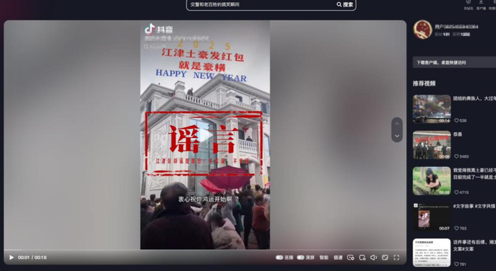 央视网消息:据“网信江津”2月6日消息,近期,有网民通过自媒体账号图文发帖称“江津土豪发红包就是豪横”,其图片显示有市民在自建房屋顶撒钱。