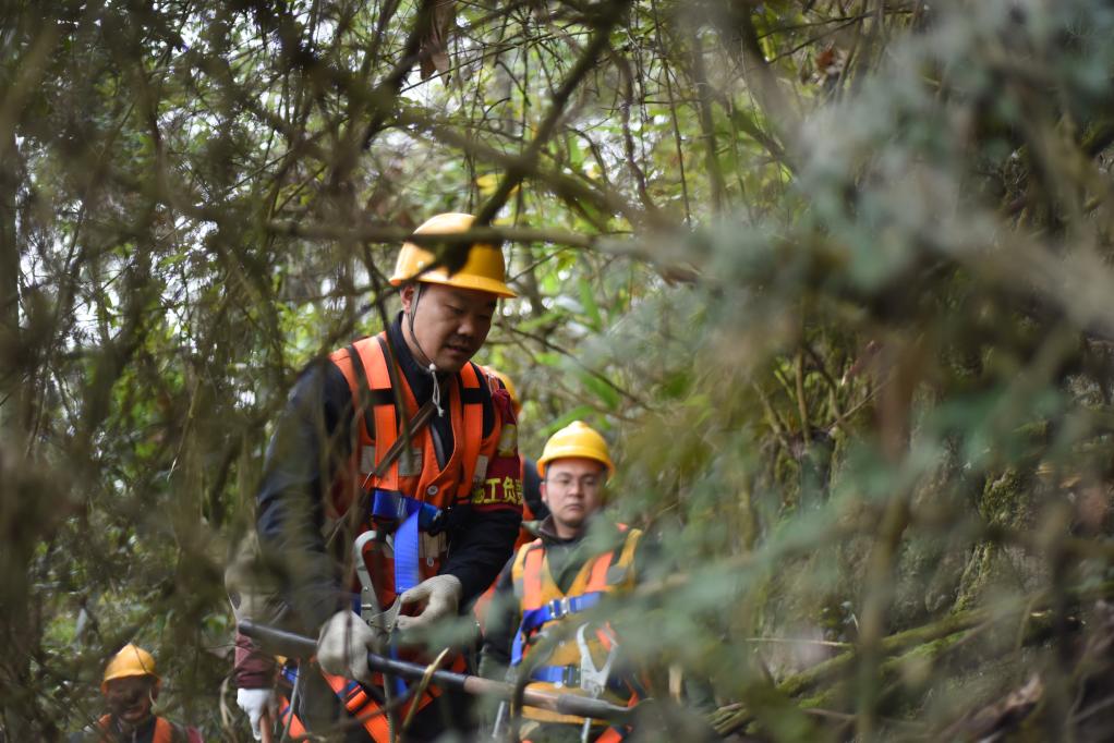 2月4日,中国铁路成都局集团有限公司贵阳工务段遵义桥路车间渝贵搜山扫危工区工长谯勇(前)和同事正在搜山。 新华社记者 郑明鸿 摄