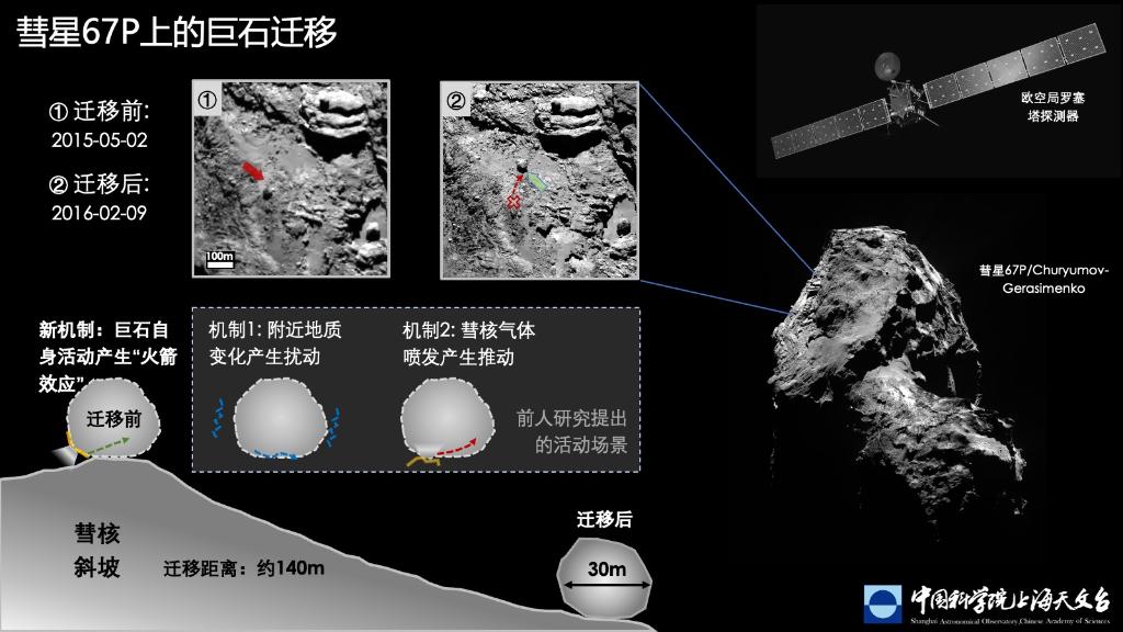 这一极细微的变化,正巧被欧洲航天局(简称欧空局或ESA)派遣的伴飞探测器上相机拍摄到。中国科学院上海天文台研究员史弦团队通过深入分析彗核图像数据后确认,这一事件发生在2015年10月3日,巨石突然运动迁移的原因,可能是石块内部挥发冰的不对称喷发导致的“火箭效应”。