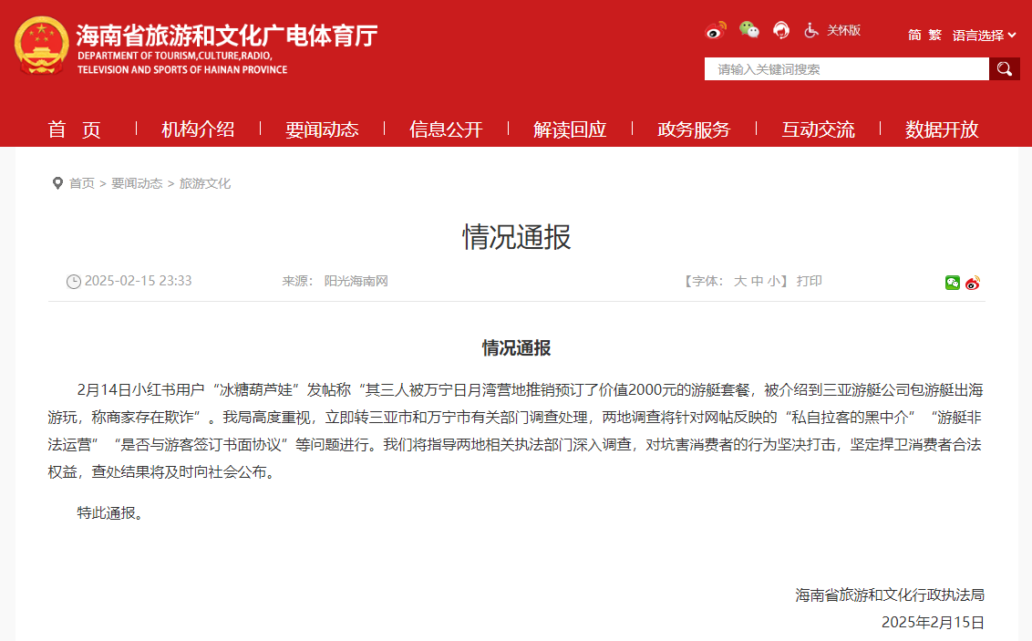 央视网消息:2月14日小红书用户“冰糖葫芦娃”发帖称“其三人被万宁日月湾营地推销预订了价值2000元的游艇套餐,被介绍到三亚游艇公司包游艇出海游玩,称商家存在欺诈”。对此,海南省旅游和文化行政执法局2月15日晚发布情况通报称,该局高度重视,立即转三亚市和万宁市有关部门调查处理,两地调查将针对网帖反映的“私自拉客的黑中介”“游艇非法运营”“是否与游客签订书面协议”等问题进行。海南省旅游和文化行政执法局表示,将指导两地相关执法部门深入调查,对坑害消费者的行为坚决打击,坚定捍卫消费者合法权益,查处结果将及时向社会公布。