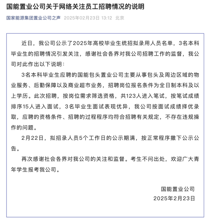 近日,国能置业公司公示了2025年高校毕业生统招拟录用人员名单,3名本科毕业生的招聘情况引发关注,感谢社会各界对国能置业公司招聘工作的监督,国能置业公司对此作出以下说明: