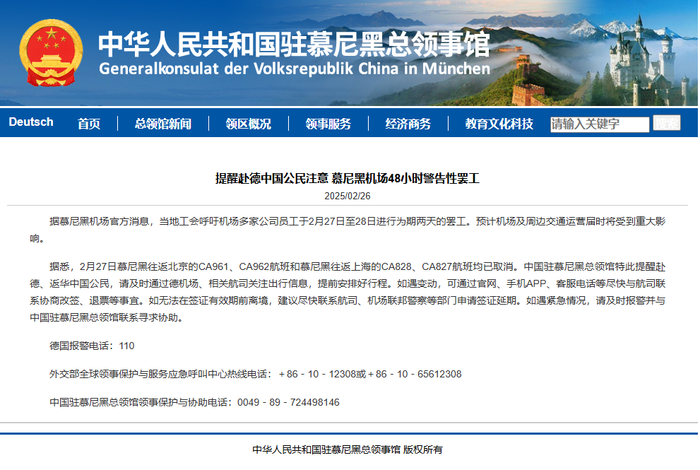 据悉,2月27日慕尼黑往返北京的CA961、CA962航班和慕尼黑往返上海的CA828、CA827航班均已取消。中国驻慕尼黑总领馆特此提醒赴德、返华中国公民,请及时通过德机场、相关航司关注出行信息,提前安排好行程。如遇变动,可通过官网、手机APP、客服电话等尽快与航司联系协商改签、退票等事宜。如无法在签证有效期前离境,建议尽快联系航司、机场联邦警察等部门申请签证延期。如遇紧急情况,请及时报警并与中国驻慕尼黑总领馆联系寻求协助。