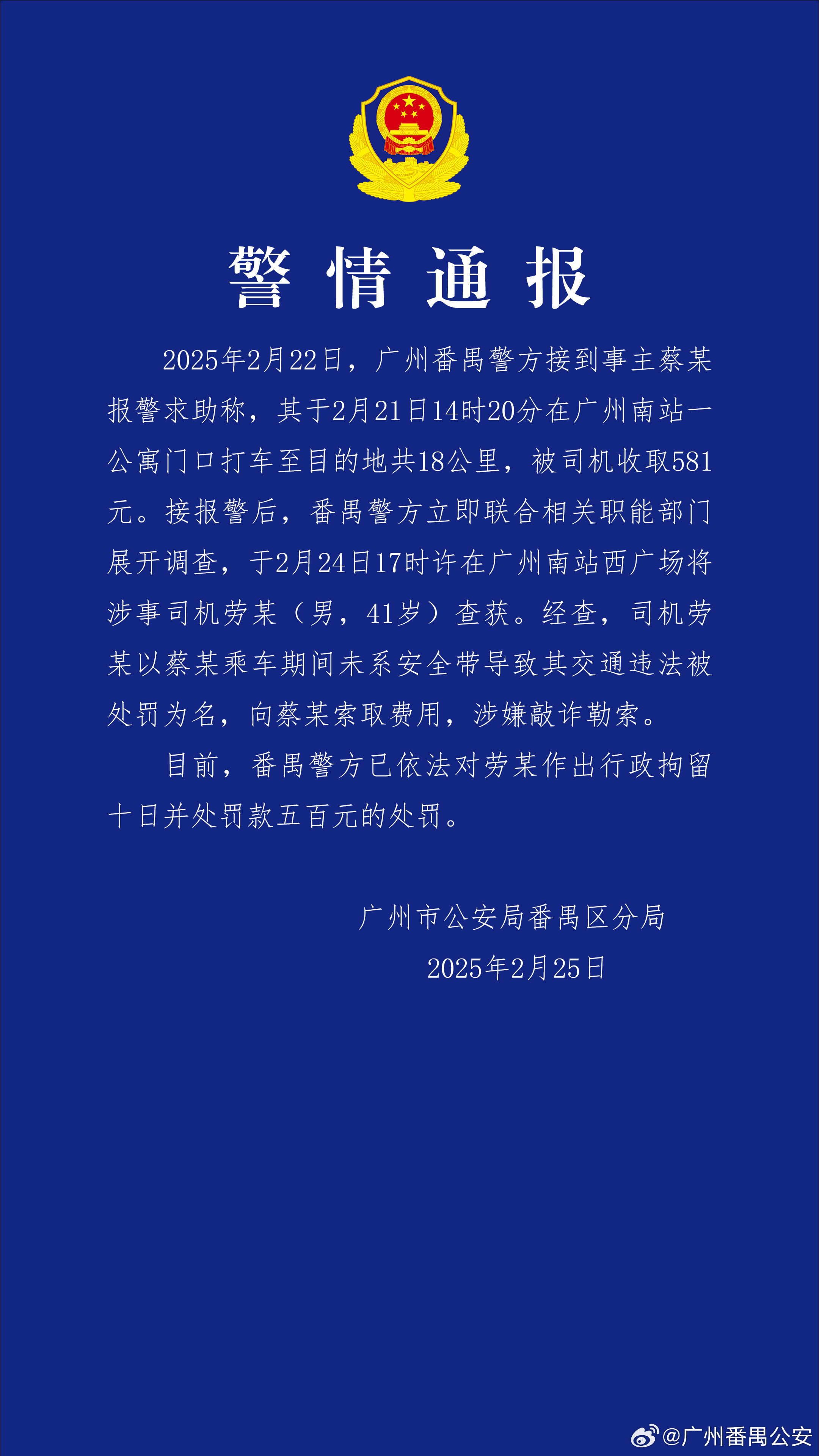 ·广州警方通报乘客打车18公里被收581元:涉事司机行拘十日并罚款五百。