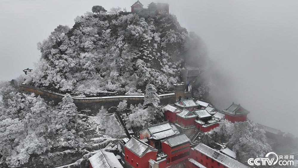 2025年2月23日,湖北十堰武当山金顶景区出现雾凇景观。由于大范围降温降雨,草木生出“玉树琼花”,金顶上银装素裹,仿佛冰雪世界。