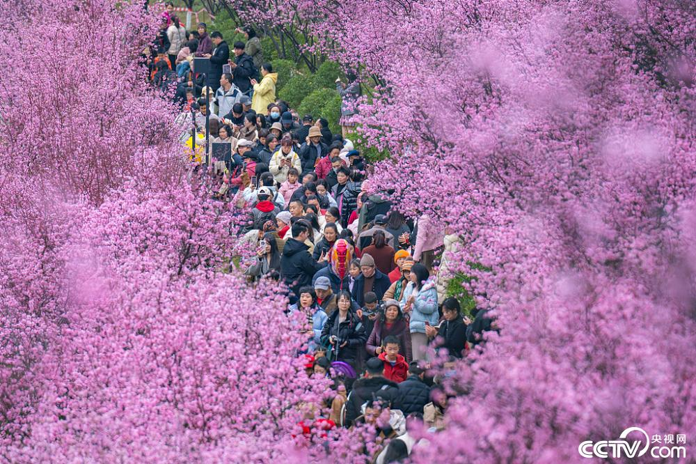 2025年2月23日,重庆,两江新区百塘园公园大片美人梅绽放,如同一片粉色花海,吸引众多市民参观游玩。