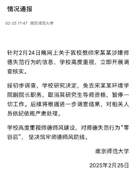 ·南京师范大学通报“副院长被指出轨女博士”:免去副院长职务,取消研究生导师资格。