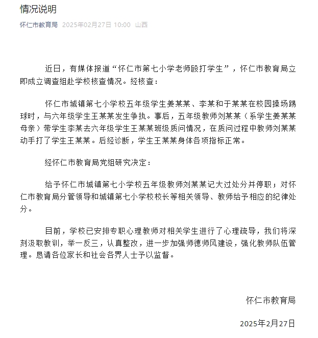 央视网消息:怀仁市教育局2月27日发布情况说明,近日,有媒体报道“怀仁市第七小学老师殴打学生”,怀仁市教育局立即成立调查组赴学校核查情况。经核查: