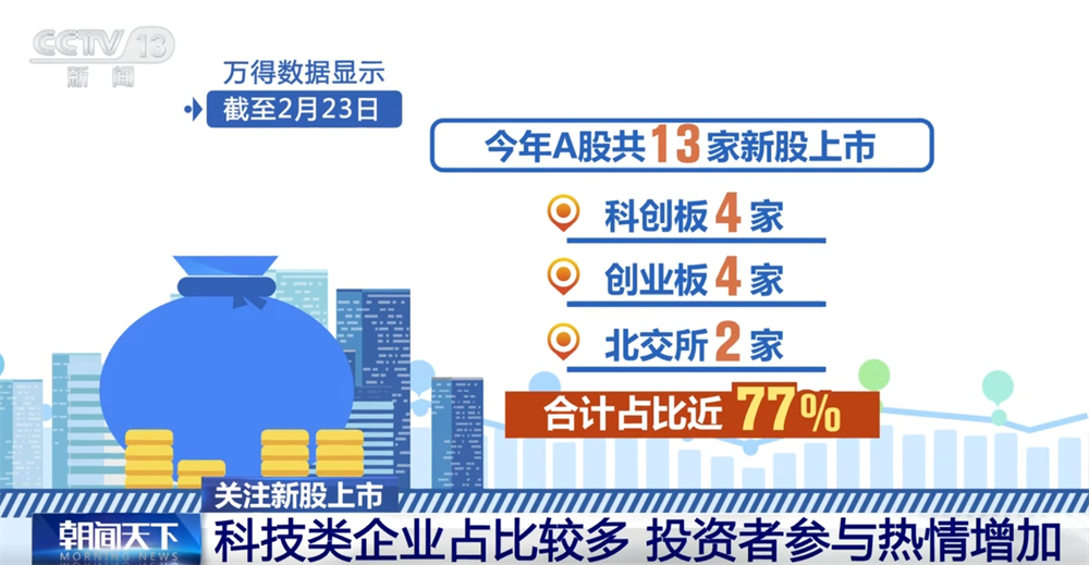 在过去半个月,A股又有6家公司获证监会同意注册,即将登陆资本市场。万得数据显示,截至2月23日,今年A股共13家新股上市,其中科创板和创业板各有4家,北交所2家,合计占比近77%。部分新股上市首日表现良好,投资者近期参与打新的积极性也明显提升。
