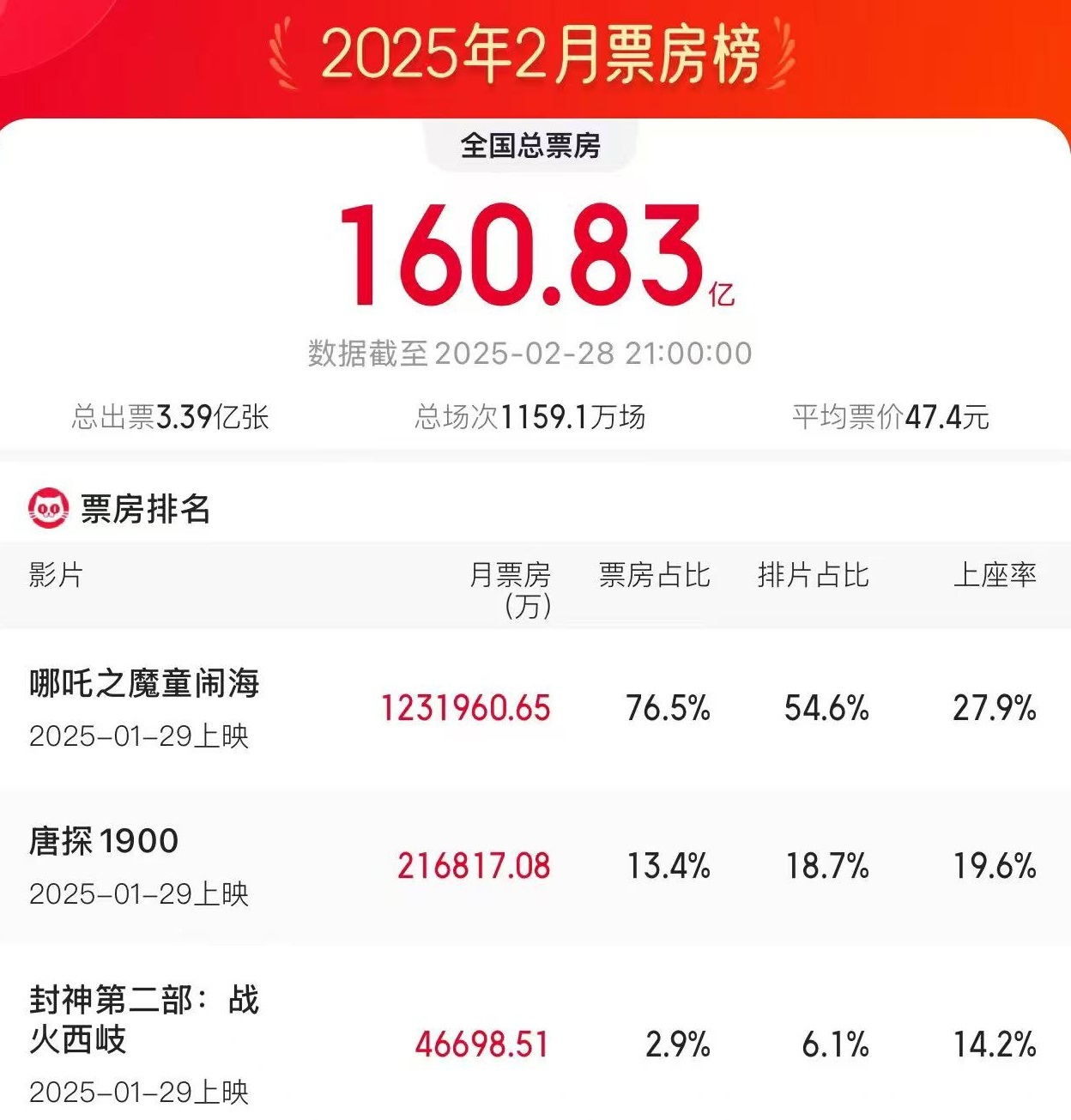 其中《哪吒之魔童闹海》2月票房超123.19亿