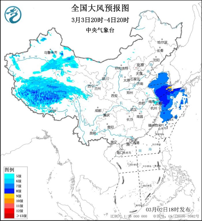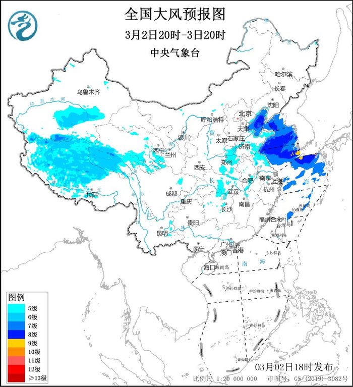 预计,3月2日20时至3日20时,黄淮、江淮东北部和西南部、江汉以及西藏中北部、青海南部、新疆南部等地有5~6级风,阵风7~8级;渤海、渤海海峡、黄海大部海域、东海北部和西南部海域将有7~8级、阵风9级的大风,其中黄海西南部、东海北部的部分海域风力可达9级、阵风10级。