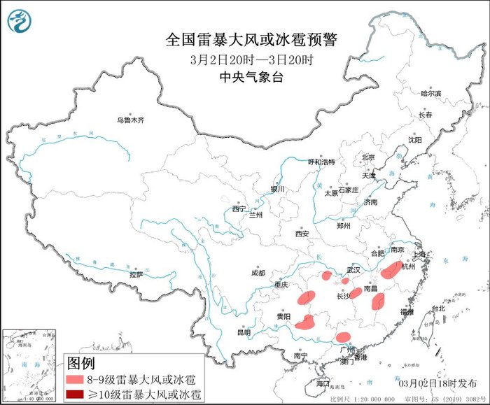 中央气象台3月2日18时继续发布强对流天气蓝色预警
