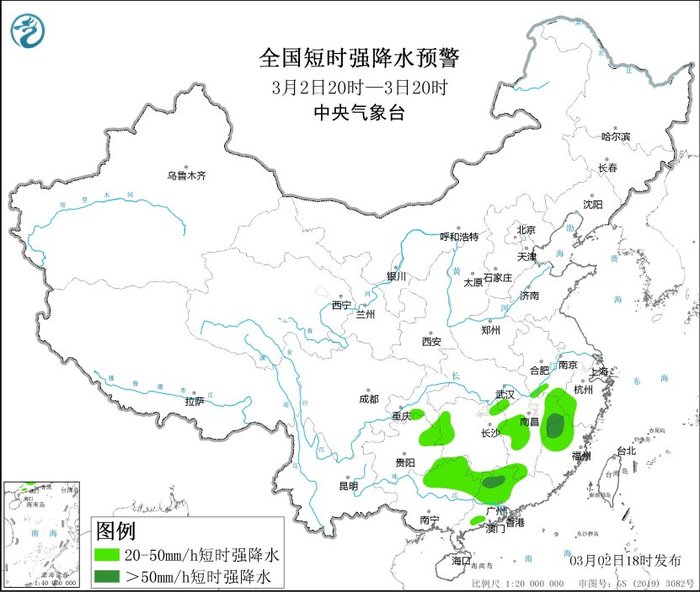 预计3月2日20时至3日20时,贵州东部、广西北部、湖南北部、安徽南部、江西中东部、浙江西部等地的部分地区将有8级以上雷暴大风或冰雹天气,局地风力可达10级;贵州东部、广西北部、湖南北部和南部、江西大部、福建西北部、浙江西部等地的部分地区将有小时雨量大于20毫米的短时强降水天气,其中,广东北部、福建西北部、江西东部等地的部分地区小时雨量大于50毫米。