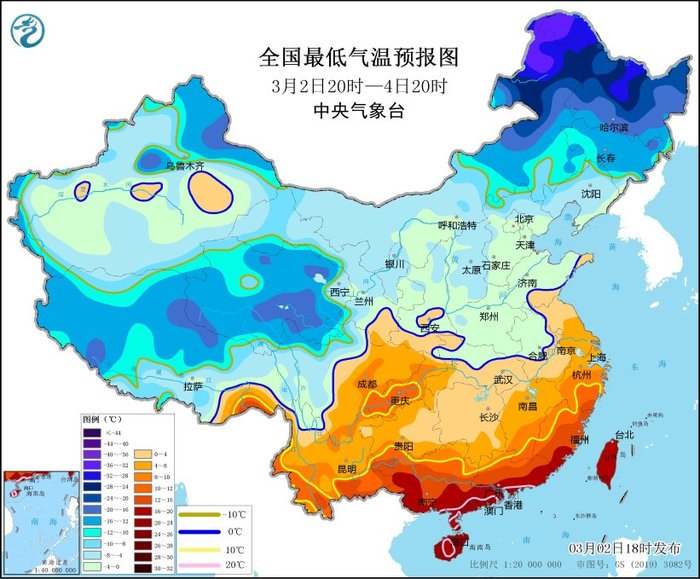 受寒潮影响,预计,3月2日20时至3月4日20时,我国中东部气温将自北向南先后下降6~10℃,其中,黄淮南部及其以南的大部地区降温12~16℃,局地降温18℃以上;4日早晨,最低气温0℃线将南压到江淮江汉至陕西南部一带。