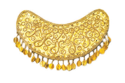 月牙形金饰牌(东汉)呈半月形,这件金饰件制作相当精美,显示出了草原文化的工艺特征。张雪竹告诉记者,“格里芬”形象作为有翼神兽的主要造型由欧亚草原逐渐传入中国,文化交融地带的草原民族是东方最早接触到“格里芬”形象的族群,从纹饰、工艺、器形上看,这件金饰牌与阿富汗西伯尔罕黄金冢出土的金器较为相似。