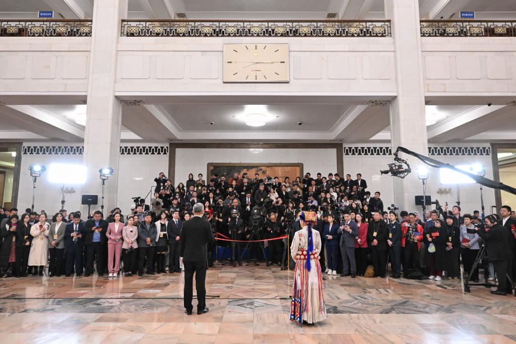 3月5日,第十四届全国人民代表大会第三次会议首场“代表通道”集中采访活动在北京人民大会堂举行。这是全国人大代表格西王姆接受媒体采访。新华社记者 胥冰洁 摄