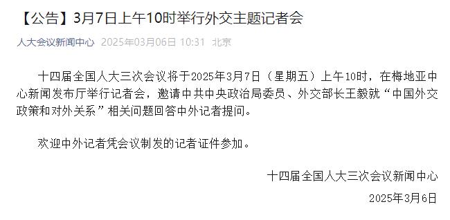 央视网消息:十四届全国人大三次会议将于2025年3月7日(星期五)上午10时,在梅地亚中心新闻发布厅举行记者会,邀请中共中央政治局委员、外交部长王毅就“中国外交政策和对外关系”相关问题回答中外记者提问。