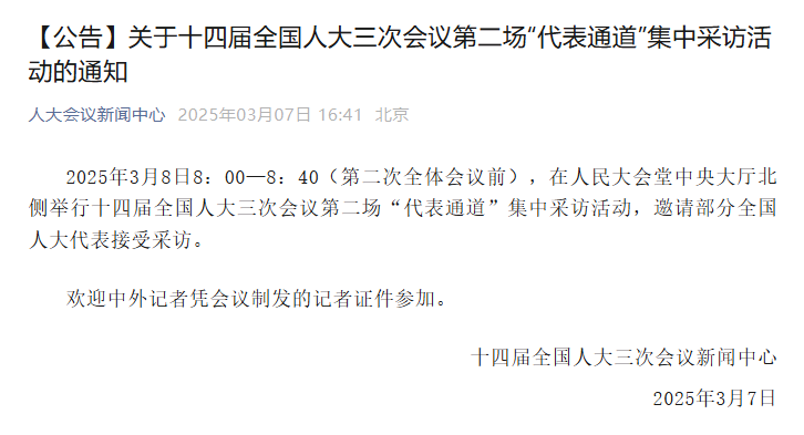 央视网消息:2025年3月8日8:00—8:40(第二次全体会议前),在人民大会堂中央大厅北侧举行十四届全国人大三次会议第二场“代表通道”集中采访活动,邀请部分全国人大代表接受采访。