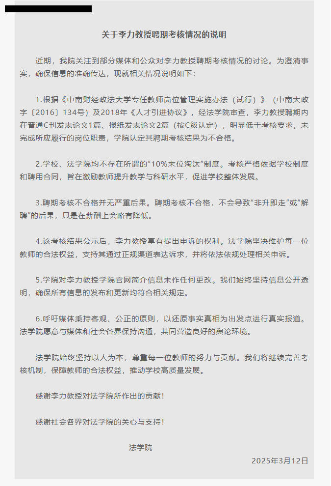 央视网消息:据中南财经政法大学法学院微信公众号消息,3月12日,中南财经政法大学法学院发布关于李力教授聘期考核情况的说明。说明称,经法学院审查,李力教授聘期内在普通C刊发表论文1篇、报纸发表论文2篇(按C级认定),明显低于考核要求,未完成所应履行的岗位职责,学院认定其聘期考核结果为不合格。说明表示,学校、法学院均不存在所谓的“10%末位淘汰”制度。聘期考核不合格并无严重后果。聘期考核不合格,不会导致“非升即走”或“解聘”的后果,只是在薪酬上会略有降低。