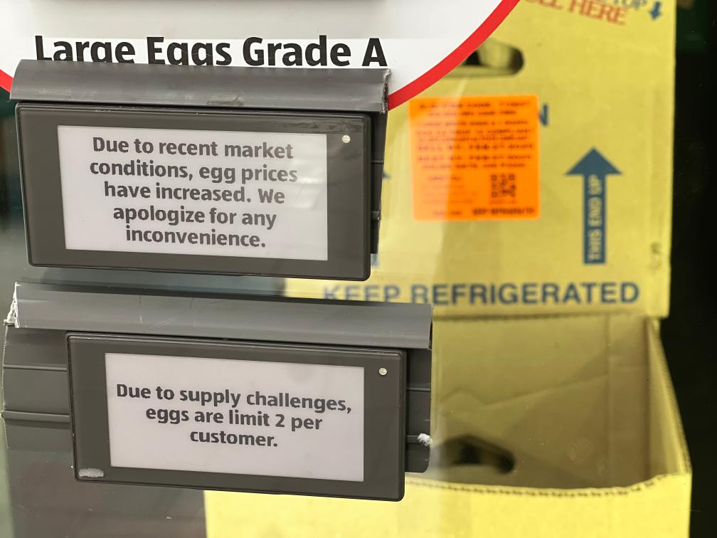 这是2月12日在美国加利福尼亚州洛杉矶县一家连锁店拍摄的鸡蛋限购通知。新华社发(曾慧摄)