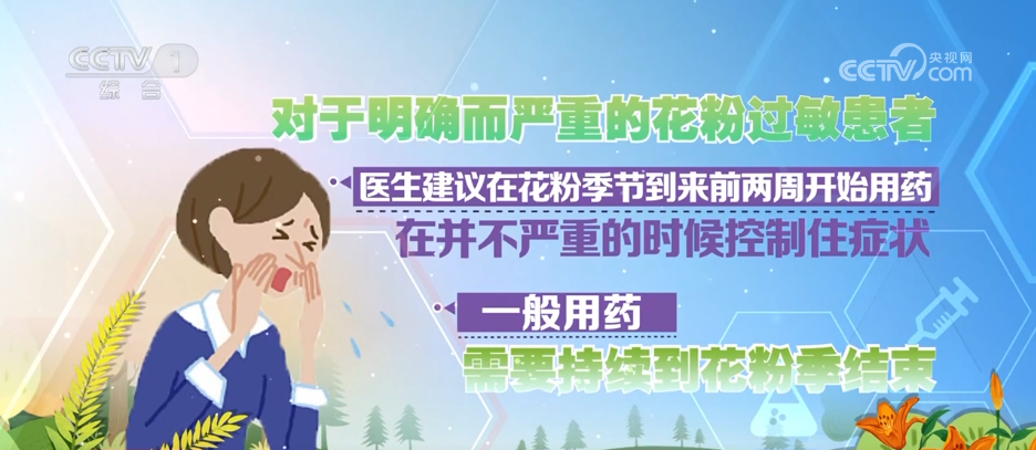 对于明确而严重的花粉过敏患者,医生建议在花粉季节到来前两周开始用药,在并不严重的时候控制住症状,一般用药需要持续到花粉季结束。