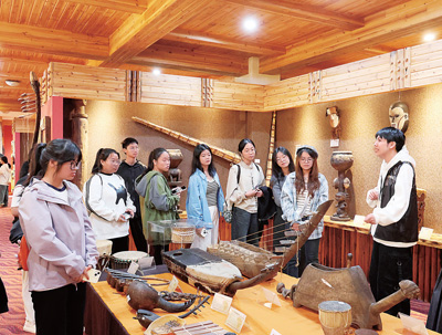 非洲博物馆志愿者(右一)向观众介绍馆内藏品。 浙江师范大学非洲研究院供图