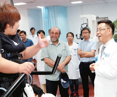 尼科莱利斯(中)与医务人员共同指导截瘫患者使用外骨骼康复机器人进行步行训练。 宣武医院供图
