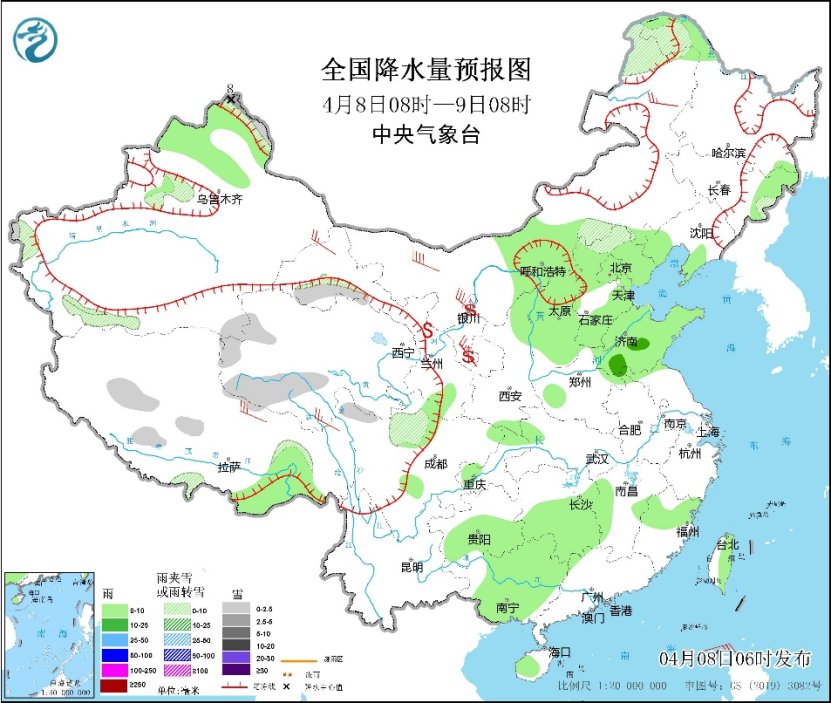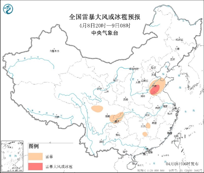 今明两天,南北方均会有降水出现,预计华北、黄淮、贵州东部、江南及华南北部等地有小到中雨,部分地区有大到暴雨,局地伴有雷暴大风、短时强降水等强对流天气。其中今天,山东中南部、河南东部、江苏北部、安徽北部等地局地将有雷暴大风或冰雹天气,山东南部等地局地还伴有短时强降水,请公众注意关注当地气象部门发布的预报、预警信息,避免在强对流活跃时段外出。