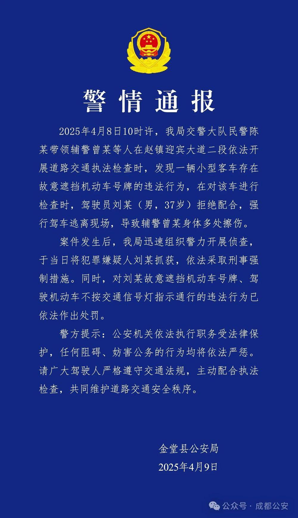 ·成都金堂县警方通报男子拒检驾车逃离致辅警擦伤:被采取刑事强制措施。