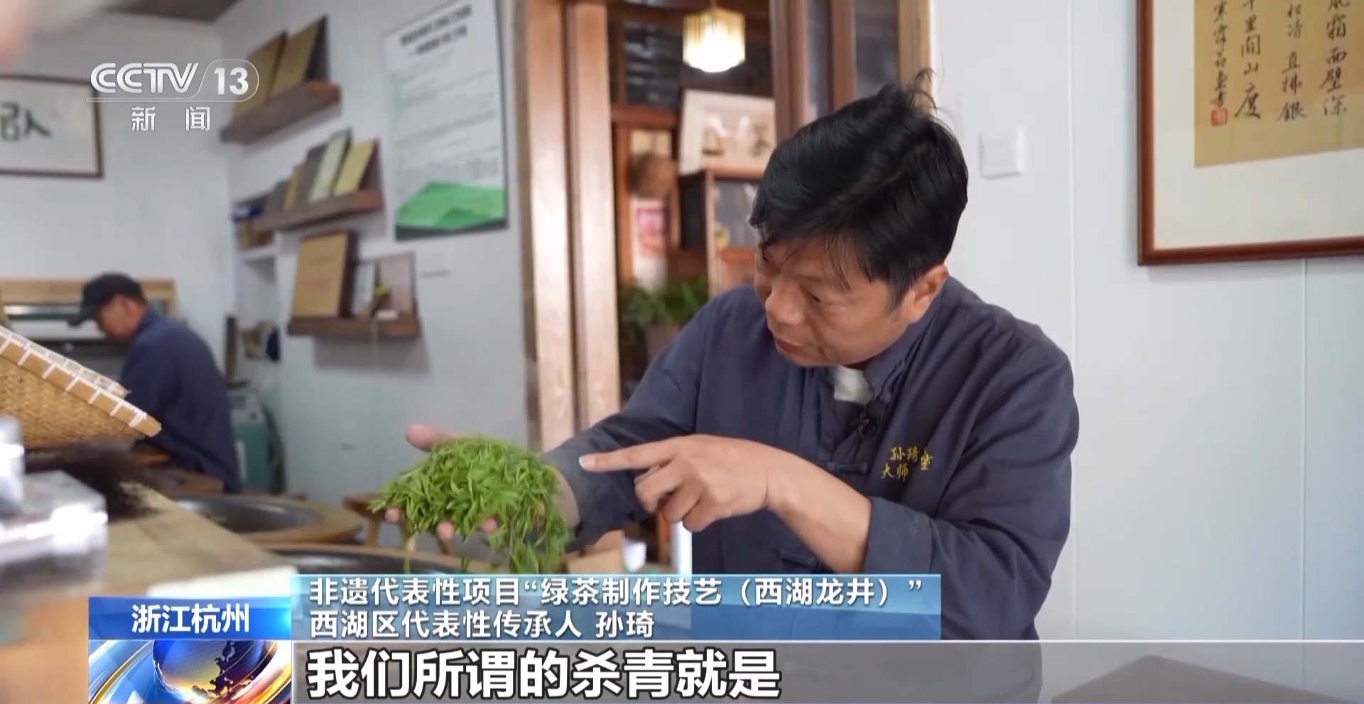 非遗代表性项目“绿茶制作技艺(西湖龙井)”西湖区代表性传承人 孙琦:杀青就是让它快速地走水,西湖龙井是色绿、香郁、味甘、形美。