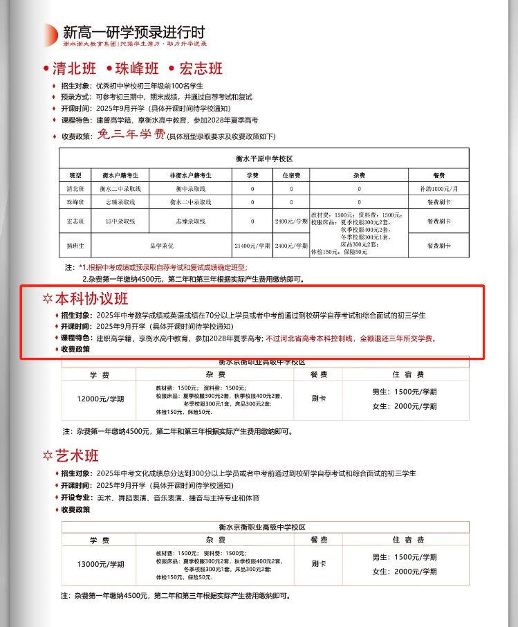 衡水京衡职业高级中学2025年招生简章显示,本科协议班明确注明“不过河北省高考本科控制线,全额退还三年所交学费”