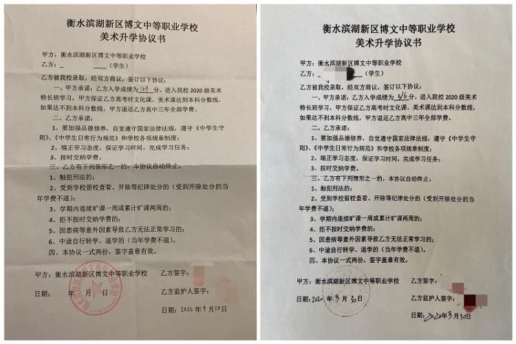 此外,张先生还提供了包含其孩子在内的多名学生与该校签署的《衡水滨湖新区博文中等职业学校美术升学协议书》,签署日期为2020年9月30日。在这份协议书中,校方承诺,学生进入该校2020级美术特长班学习,校方保证学生高考时文化课、美术课达到本科分数线,如果达不到本科分数线,将退还学生高中3年全部学费。