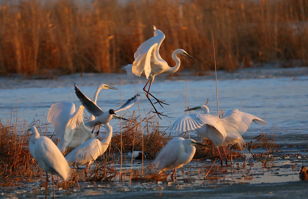 4月11日,新疆阿勒泰地区福海县,一群白鹭在湿地栖息、觅食。