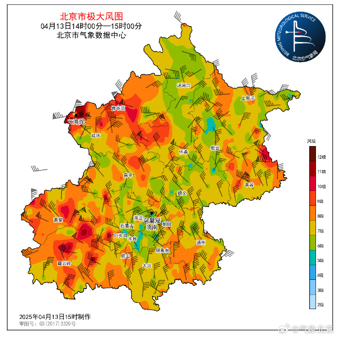 央视网消息:据@气象北京微博消息,最近1小时(13日14-15时)北京市大部分地区阵风7~9级,局地阵风10级以上。全市有192个测站极大风达8级以上(占比34%),55个测站极大风达9级以上(占比10%),23个测站极大风达10级以上(占比4%)。10级以上的站出现在丰台、房山、、怀柔、平谷、门头沟、延庆。全市最大阵风风速:延庆二海陀36.7米/秒(12级);平原地区为房山燕山,为25.7米/秒(9级)。