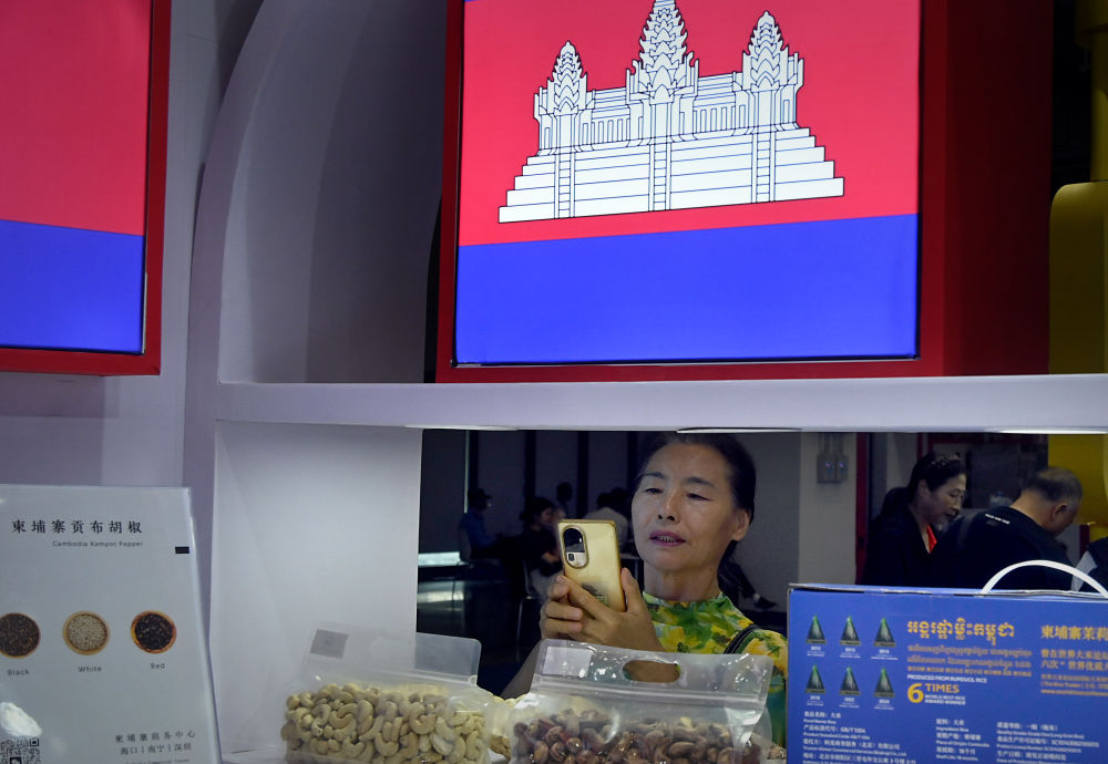 ↑4月17日,在消博会4号馆的柬埔寨展区,一位市民在拍摄展台上的腰果产品。王颂 摄