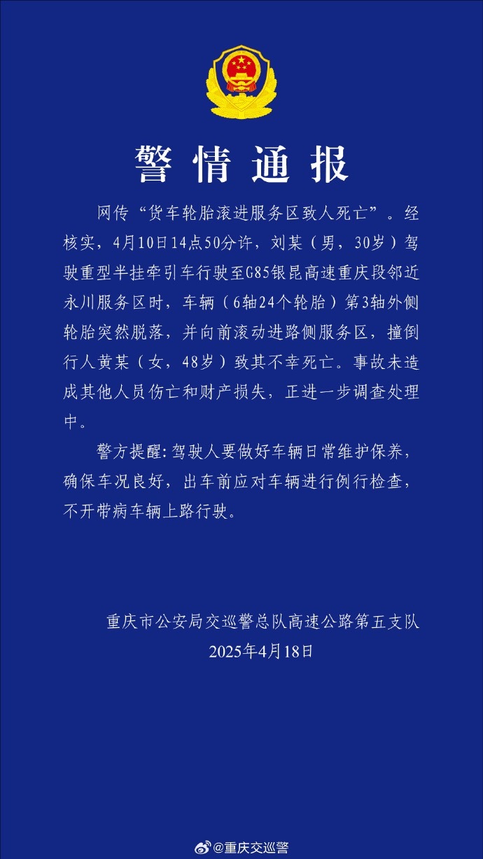 央视网消息:4月18日,@重庆交巡警 微博通报网传“货车轮胎滚进服务区致人死亡”:经核实,4月10日14点50分许,刘某(男,30岁)驾驶重型半挂牵引车行驶至G85银昆高速重庆段邻近永川服务区时,车辆(6轴24个轮胎)第3轴外侧轮胎突然脱落,并向前滚动进路侧服务区,撞倒行人黄某(女,48岁)致其不幸死亡。事故未造成其他人员伤亡和财产损失,正进一步调查处理中。