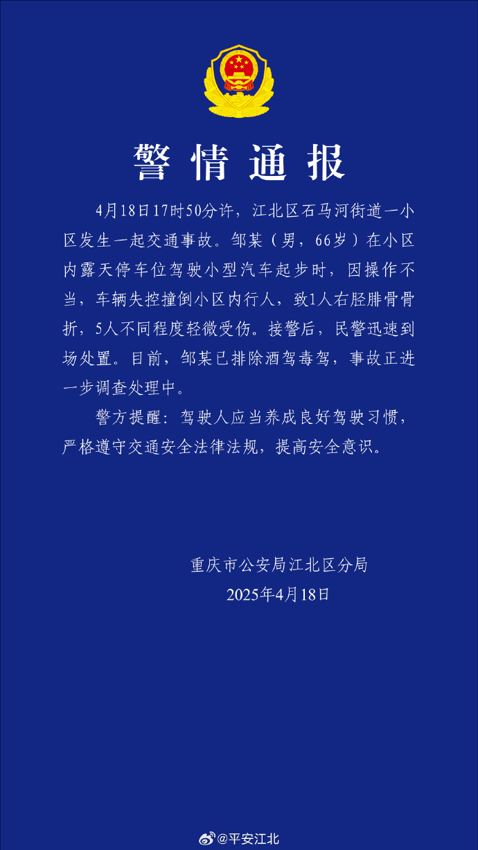 央视网消息:据重庆市公安局江北区分局官方微博消息,重庆市公安局江北区分局发布警情通报,4月18日17时50分许,江北区石马河街道一小区发生一起交通事故。邹某(男,66岁)在小区内露天停车位驾驶小型汽车起步时,因操作不当,车辆失控撞倒小区内行人,致1人右胫腓骨骨折,5人不同程度轻微受伤。接警后,民警迅速到场处置。目前,邹某已排除酒驾毒驾,事故正进一步调查处理中。