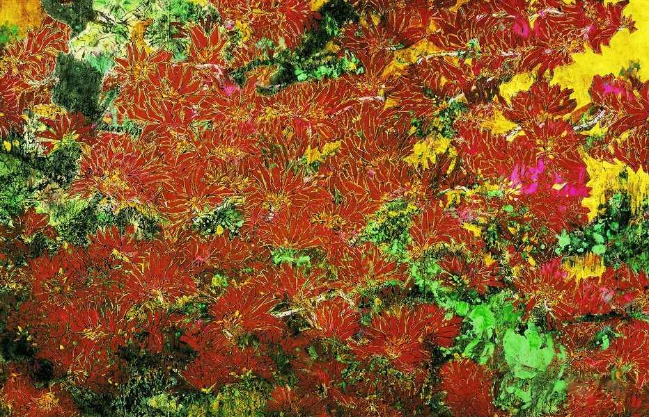 在传统笔墨与现代构成的融合上,郭怡孮的艺术创作呈现出鲜明特征。中央文史研究馆馆员张立辰认为,郭怡孮跳脱出“以线为主”的古典写意范式,将传统勾勒法与现代表现形式结合,形成兼具写意性与装饰性的新语言。中央文史研究馆特约研究员马新林表示,郭怡孮在传统工笔重彩基础上创造了独特的“重彩写意”风格。