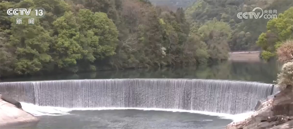 在武夷山国家公园一号风景道的月亮湾,一座月牙形的水坝坐落在绿水青山之间。水流从水坝上倾泻而下,形成一帘小型瀑布。溪流清澈见底、碧绿如玉,宛如一条丝带缠绕在山间,游客们纷纷拿起相机,定格这如诗般的美景。