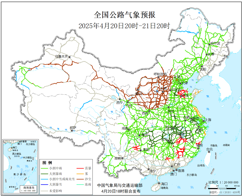 央视网消息:据交通运输部微信公众号消息,全国公路气象预报(4月20日20时至21日20时)发布。