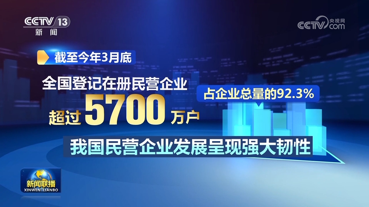 一季度,全国新设民营企业197.9万户,同比增长7.1%,超过过去三年平均增速。截至今年3月底,全国登记在册民营企业超过5700万户,占企业总量的92.3%。我国民营企业发展呈现强大韧性。