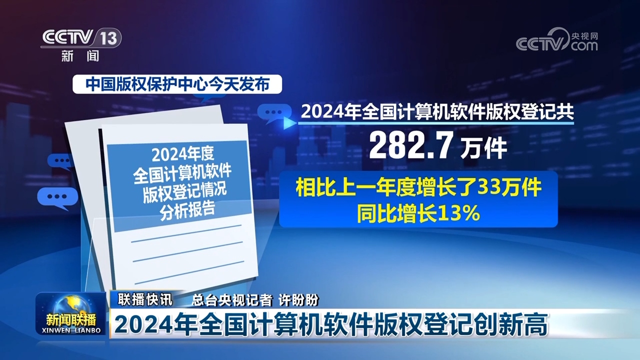中国版权保护中心4月21日发布《2024年度全国计算机软件版权登记情况分析报告》,显示2024年全国计算机软件版权登记共282.7万件,相比上一年度增长了33万件,同比增长13%,创历史新高。